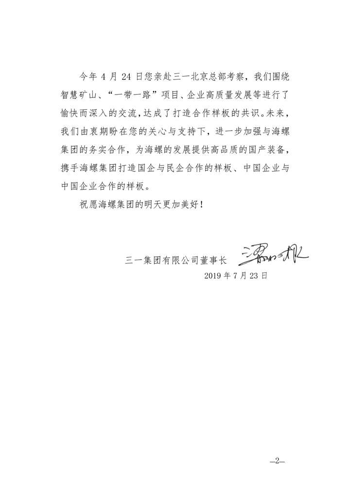 三一集團(tuán)董事長梁穩(wěn)根致高登榜賀信