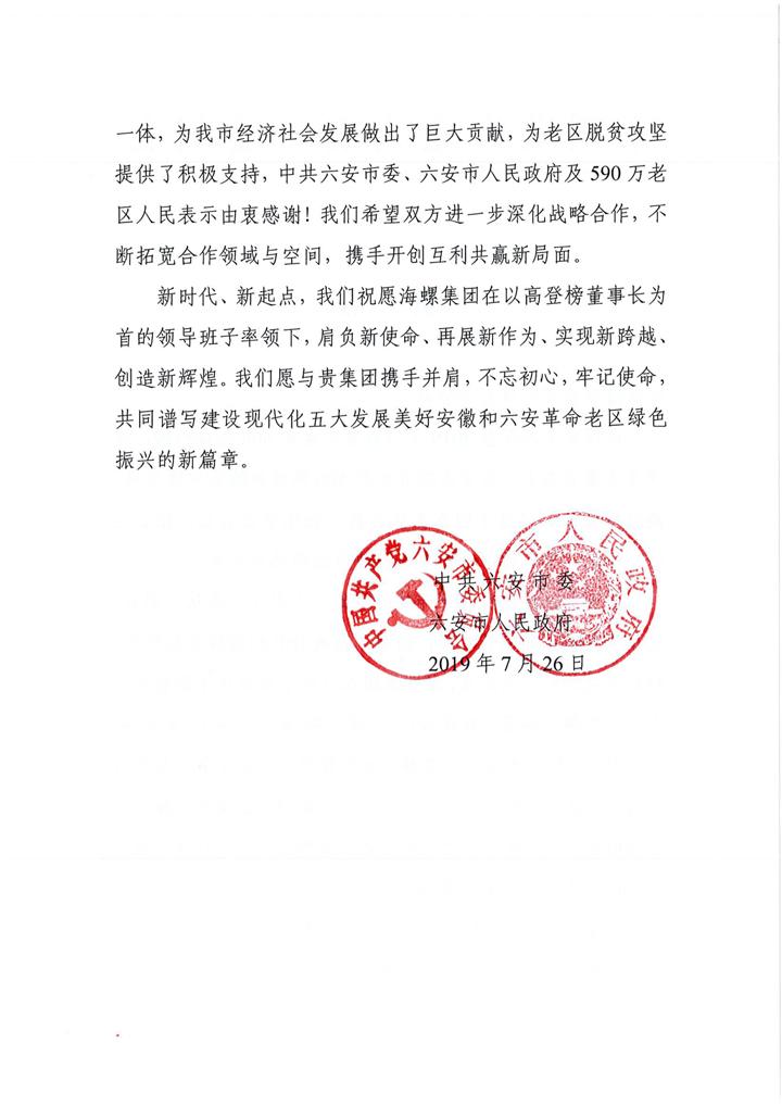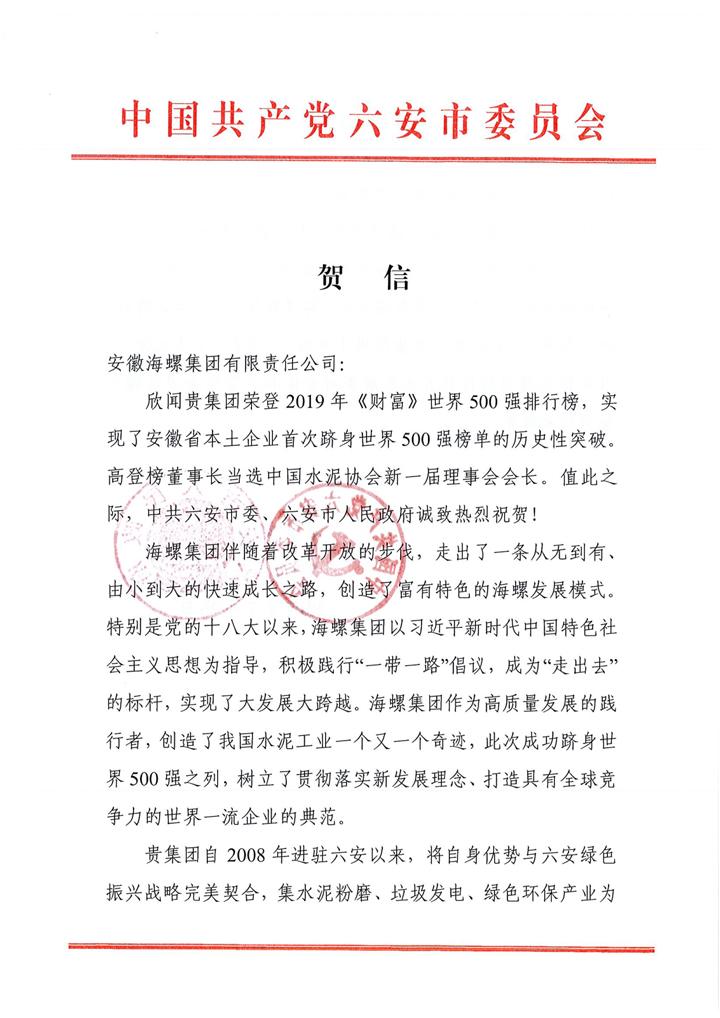 六安市委、市政府致海螺集團賀信